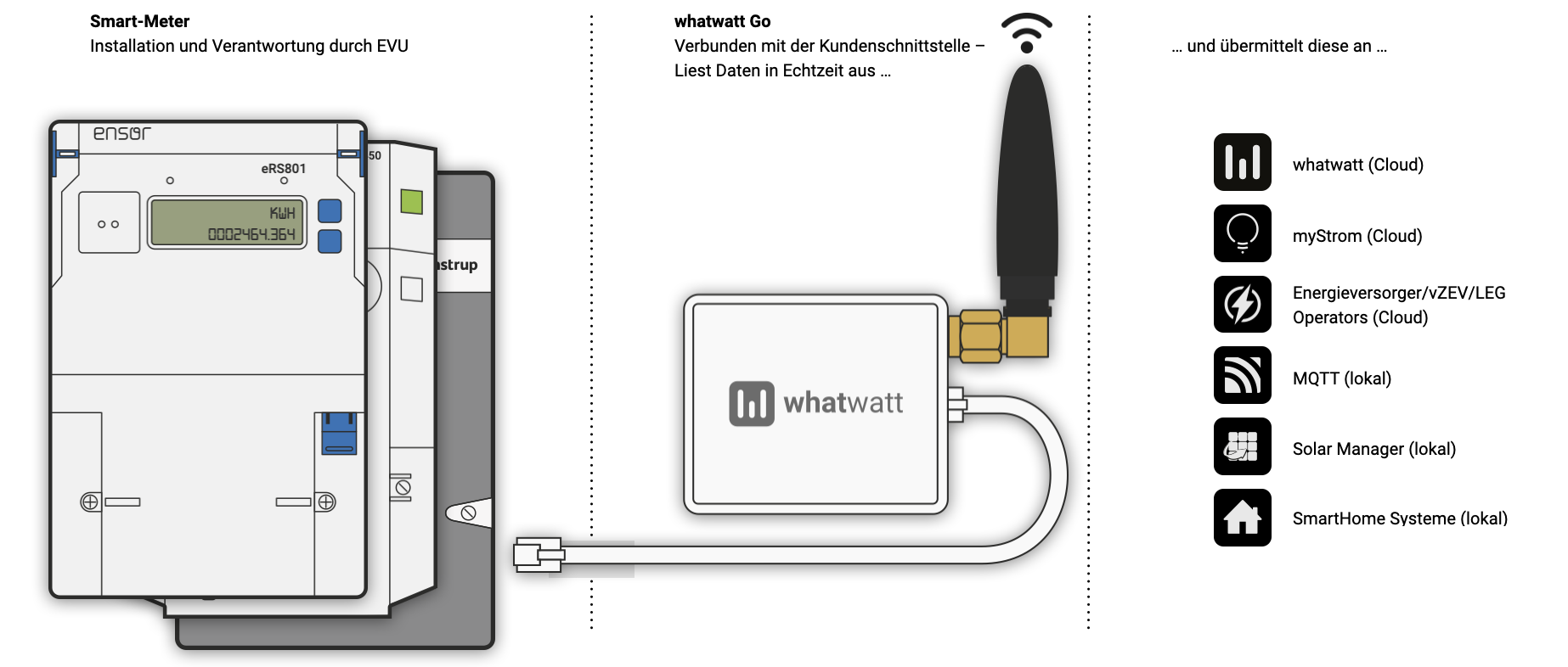 whatwatt ha sviluppato l'adattatore whatwatt Go (1), che viene collegato all'interfaccia cliente dello Smart Meter del cliente e ne rende disponibili i dati tramite LAN o WLAN. Il vantaggio principale di whatwatt Go è il supporto di tutti gli Smart Meter comunemente utilizzati in Svizzera e l'interfaccia cliente non standardizzata è coperta da un unico dispositivo.