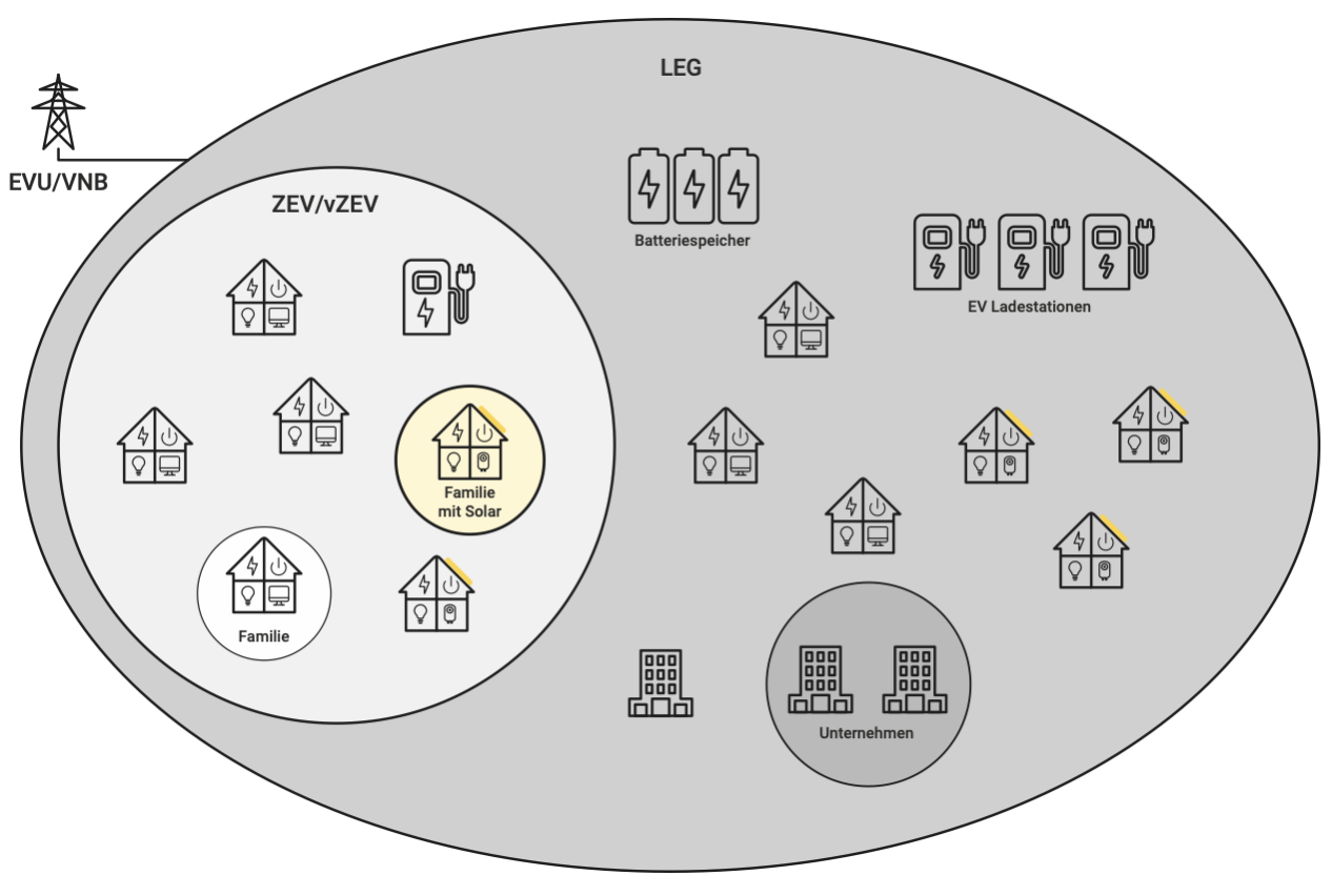Im Zuge des neuen Bundesgesetzes für eine sichere Stromversorgung (Stromversorgungsverordnung) werden in der Schweiz ab dem 1. Januar 2025 die Möglichkeiten für den nachhaltigen Eigenverbrauch von lokalem Solarstrom erweitert. Dazu wird der seit 2018 zugelassene Zusammenschluss zum Eigenverbrauch (ZEV) durch zwei weitere Konzepte ergänzt (VZEV & LEG). In lokalen Elektrizitätsgemeinschaften (LEG) ist das Gebiet noch weiter gefasst und es können sich verschiedenste Gebäude in der gleichen Gemeinde und unter Einbezug des öffentlichen Netzes zusammenschliessen. Das heisst, anstatt überschüssigen Strom unkontrolliert ins Netz einzuspeisen, können sich Nachbarn, Gemeinden oder Unternehmen so organisieren, dass sie den lokal erzeugten Strom möglichst selbst verbrauchen.