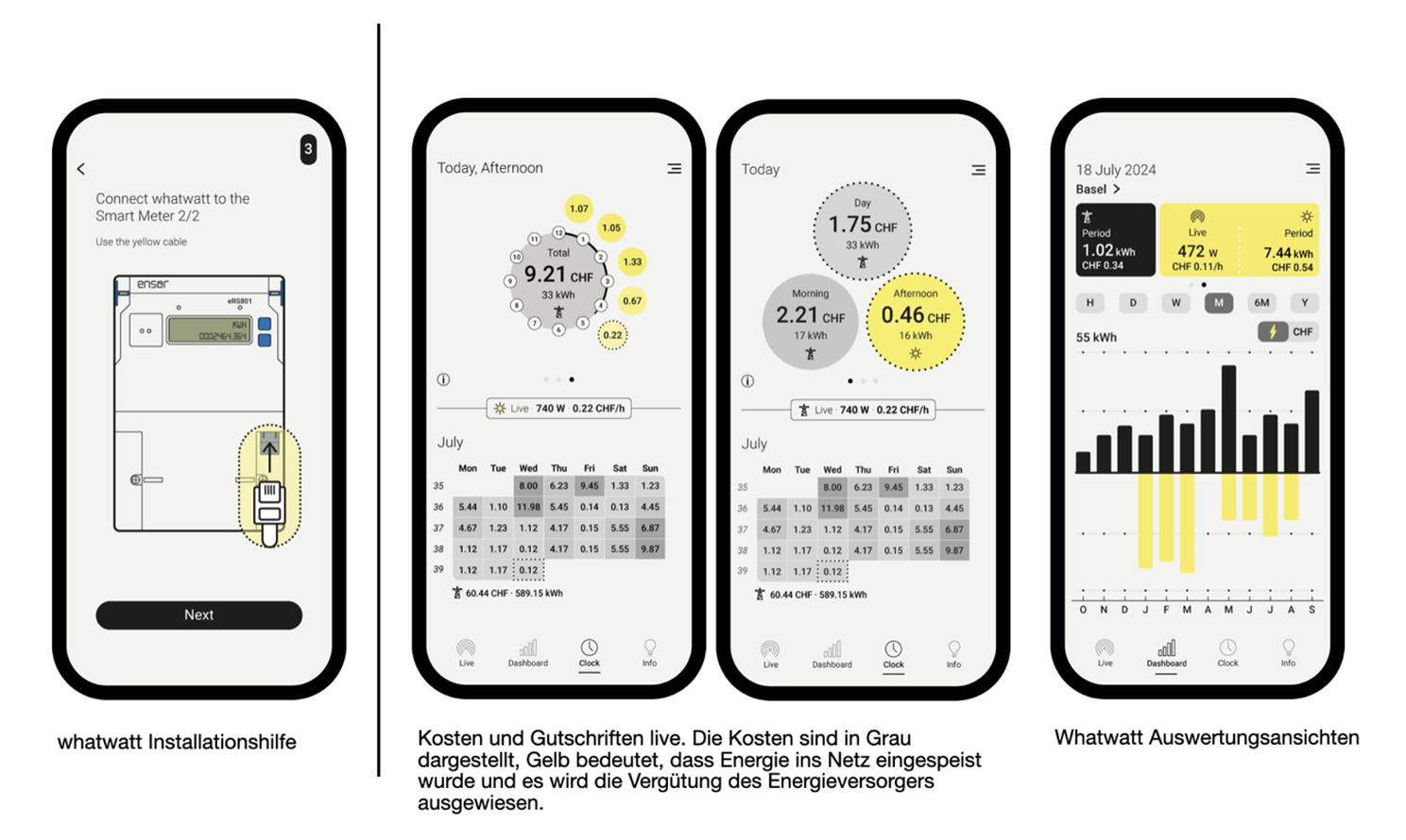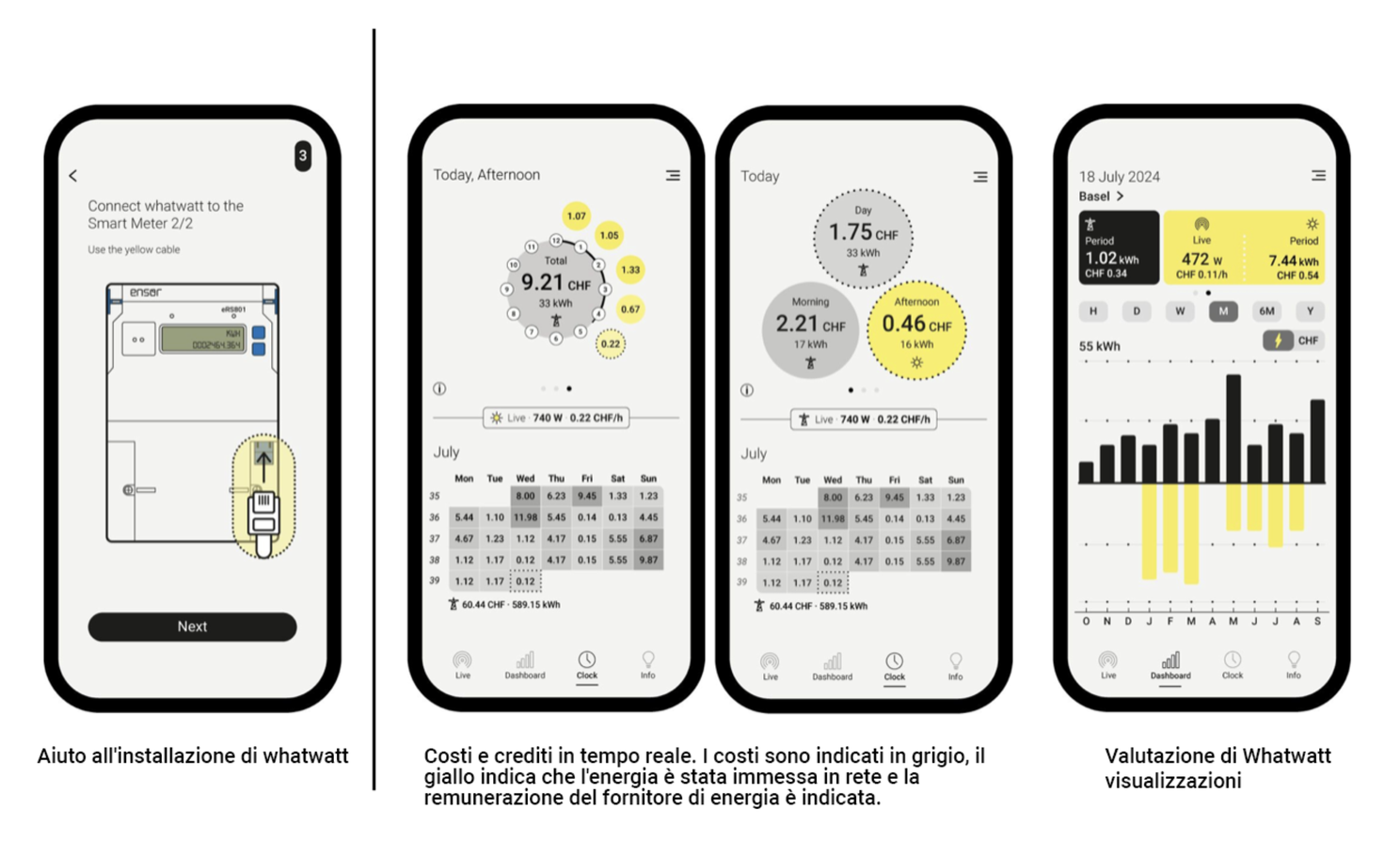 Costi e consumi sotto controllo – con l'app whatwatt, gli utenti hanno un migliore controllo dei costi dell'elettricità. Oltre ai tradizionali grafici di consumo, whatwatt ha sviluppato nuove visualizzazioni che mostrano i costi dell'energia in tempo reale in ogni momento. Chi ha un impianto solare, ha una panoramica in tempo reale dei costi meno i crediti per l'energia immessa in rete.