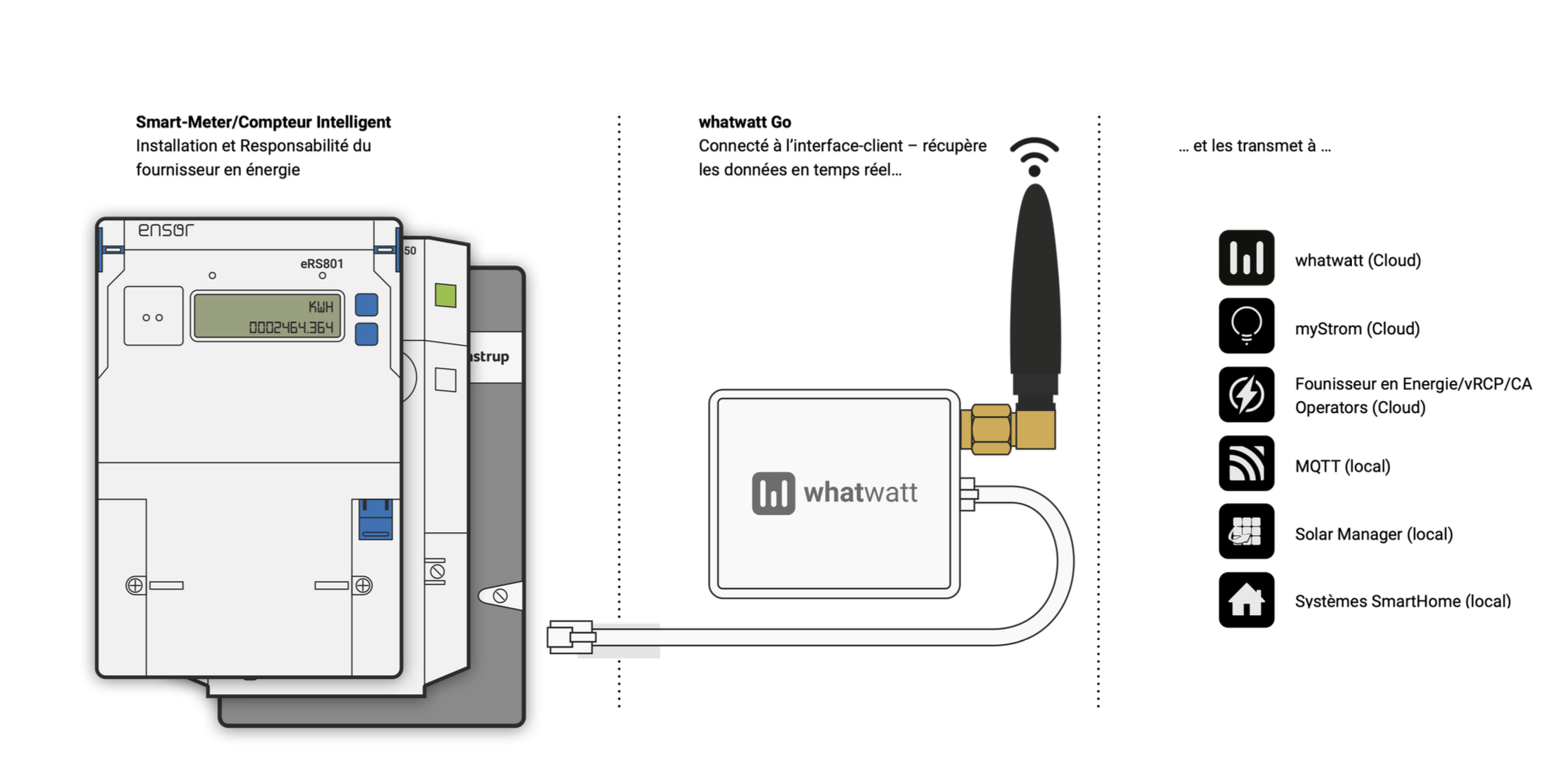 whatwatt a développé l’adaptateur whatwatt Go(1), qui se connecte à l’interface client du compteur intelligent et rend les données de consommation électrique accessibles via le réseau local, que ce soit par LAN ou par Wi-Fi. Un avantage majeur du whatwatt Go est sa compatibilité avec tous les compteurs intelligents courants installés en Suisse, ainsi qu'avec toutes les interfaces client, même si celles-ci ne sont pas standardisées en Suisse.