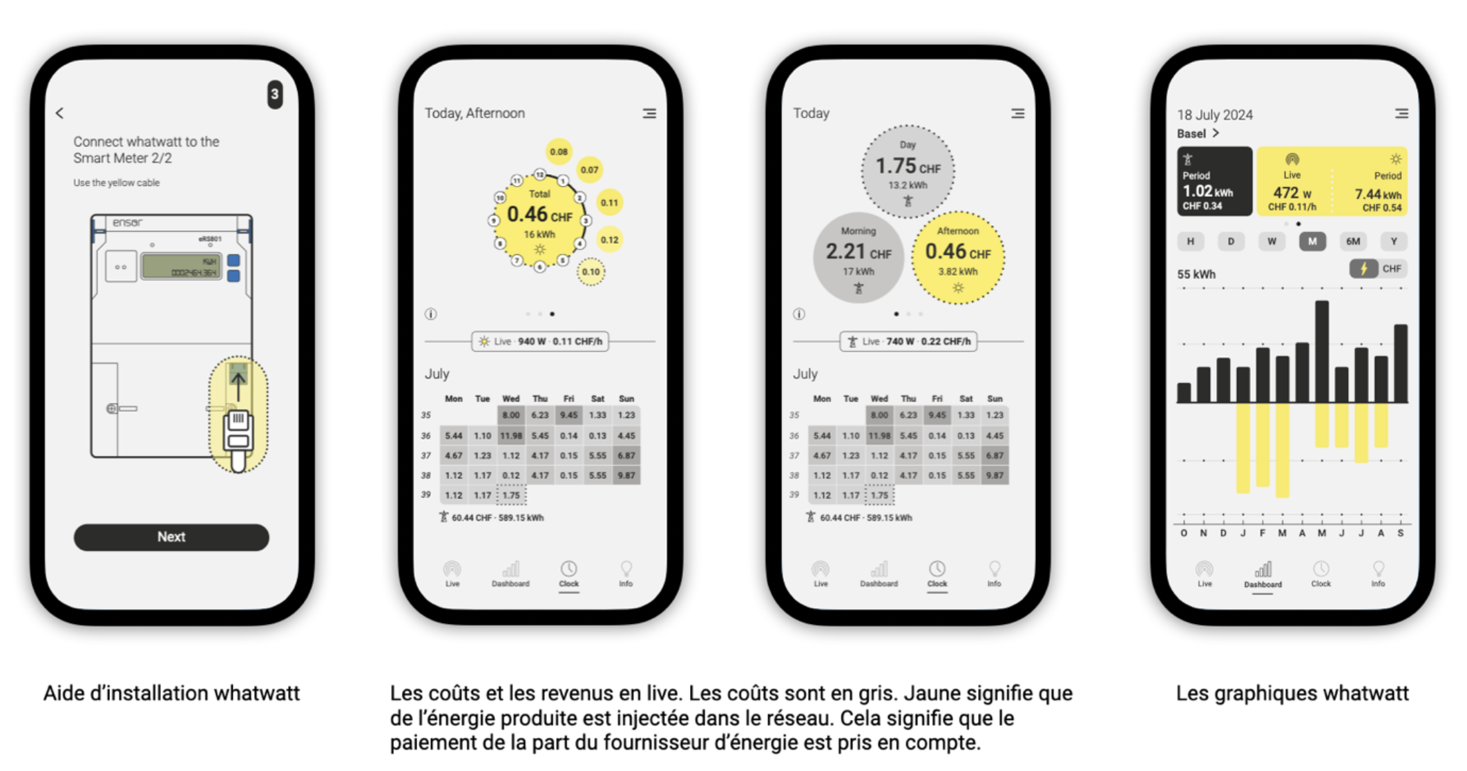 Consommation et coûts sous contrôle – Grâce à l’application mobile Whatwatt, les utilisateur·rice·s peuvent mieux gérer leurs coûts en électricité. En plus des graphiques habituels montrant la consommation, Whatwatt a développé de nouvelles visualisations qui affichent les coûts réels en temps réel. Les personnes disposant d’une installation photovoltaïque peuvent également voir instantanément, en temps réel, leurs coûts après déduction des montants dus pour l’énergie produite et réinjectée dans le réseau. Lors de l’installation de Whatwatt, l’utilisateur·rice peut sélectionner son plan tarifaire à partir d’une liste. whatwatt sauvegarde et met à jour les plan tarifaires de tous les fournisseurs d’énergie suisses dans une banque de données.