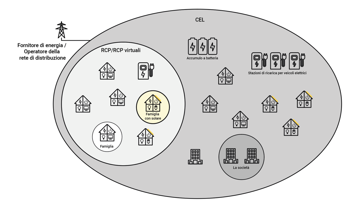 Nell'ambito della nuova legge federale per un approvvigionamento elettrico sicuro (Ordinanza sull'approvvigionamento elettrico), a partire dal 1° gennaio 2025 in Svizzera saranno ampliate le possibilità di autoconsumo sostenibile di energia solare locale. A tal fine, raggruppamento ai fini del consumo proprio (RCP/RCP virtuali), autorizzata dal 2018, sarà integrata da altri due concetti (RCP e CEL). Nelle comunità energetiche locali (CEL), l'area è ancora più ampia e una vasta gamma di edifici nello stesso comune può unirsi, compresa la rete pubblica. Ciò significa che, invece di immettere l'elettricità in eccesso nella rete in modo incontrollato, i vicini, i comuni o le aziende possono organizzarsi in modo da consumare essi stessi l'elettricità prodotta localmente, ove possibile.